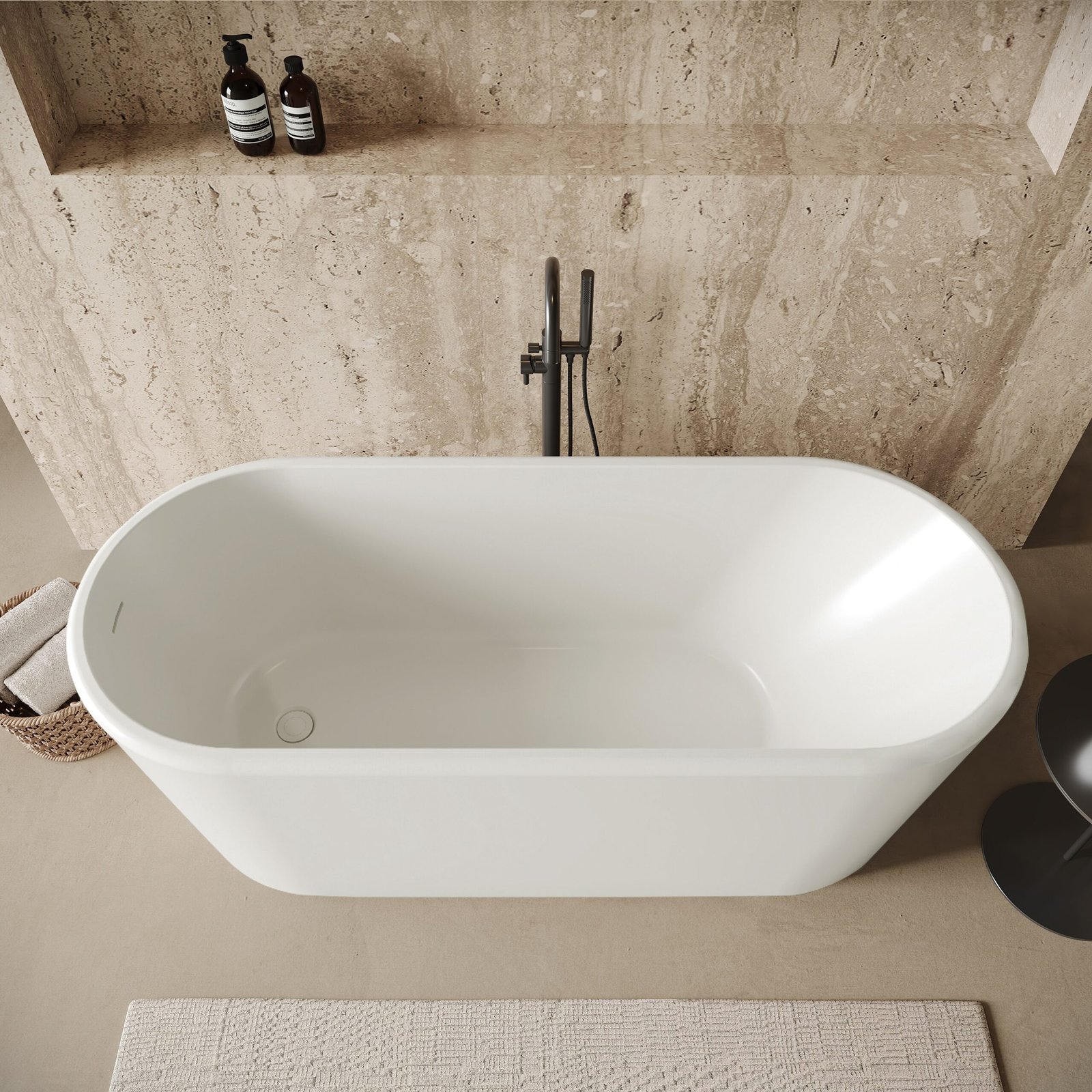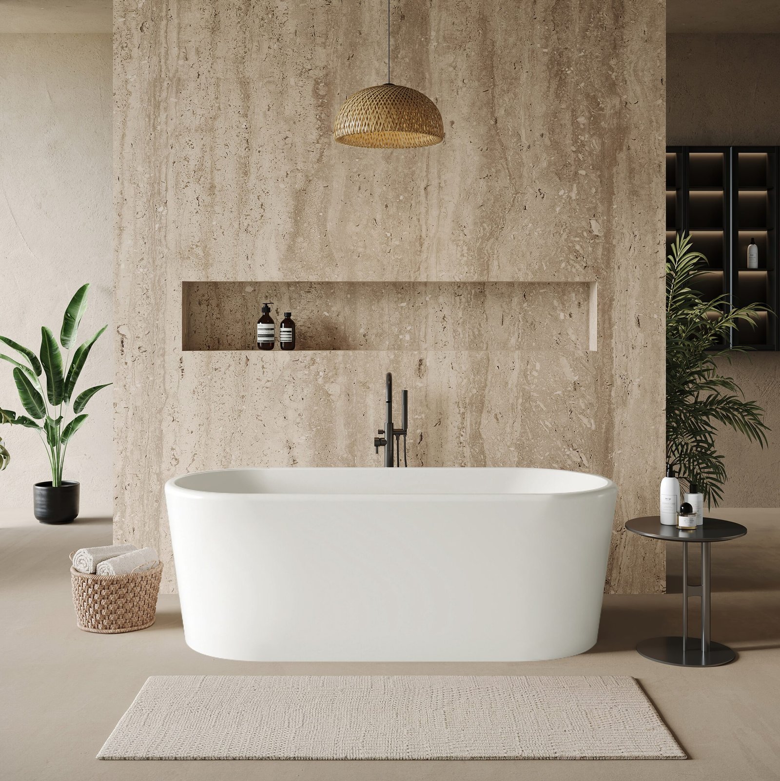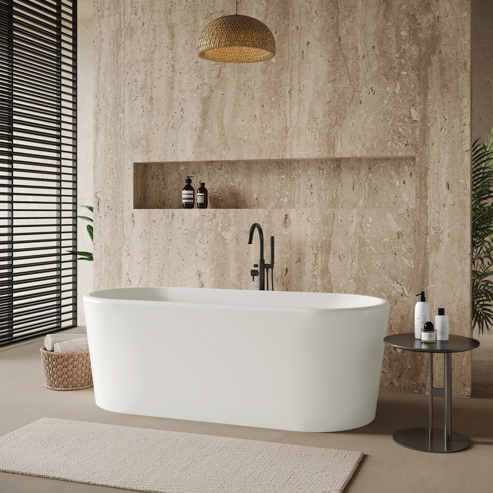 This freestanding bathtub features straight vertical sides with softened corners, creating a refined silhouette that fits perfectly into contemporary interiors. Its generous soaking depth and ergonomic design offer a balanced blend of aesthetics and comfort.