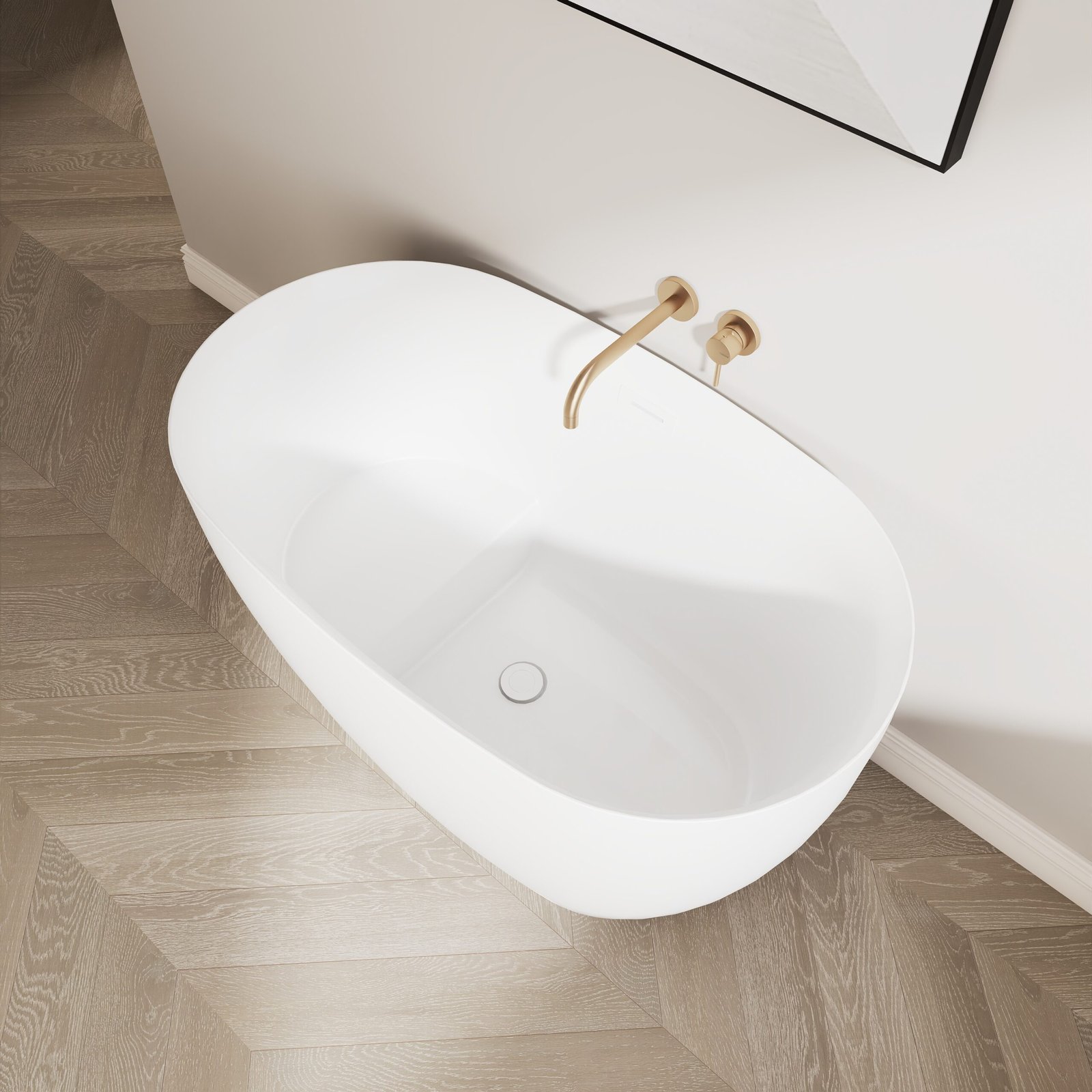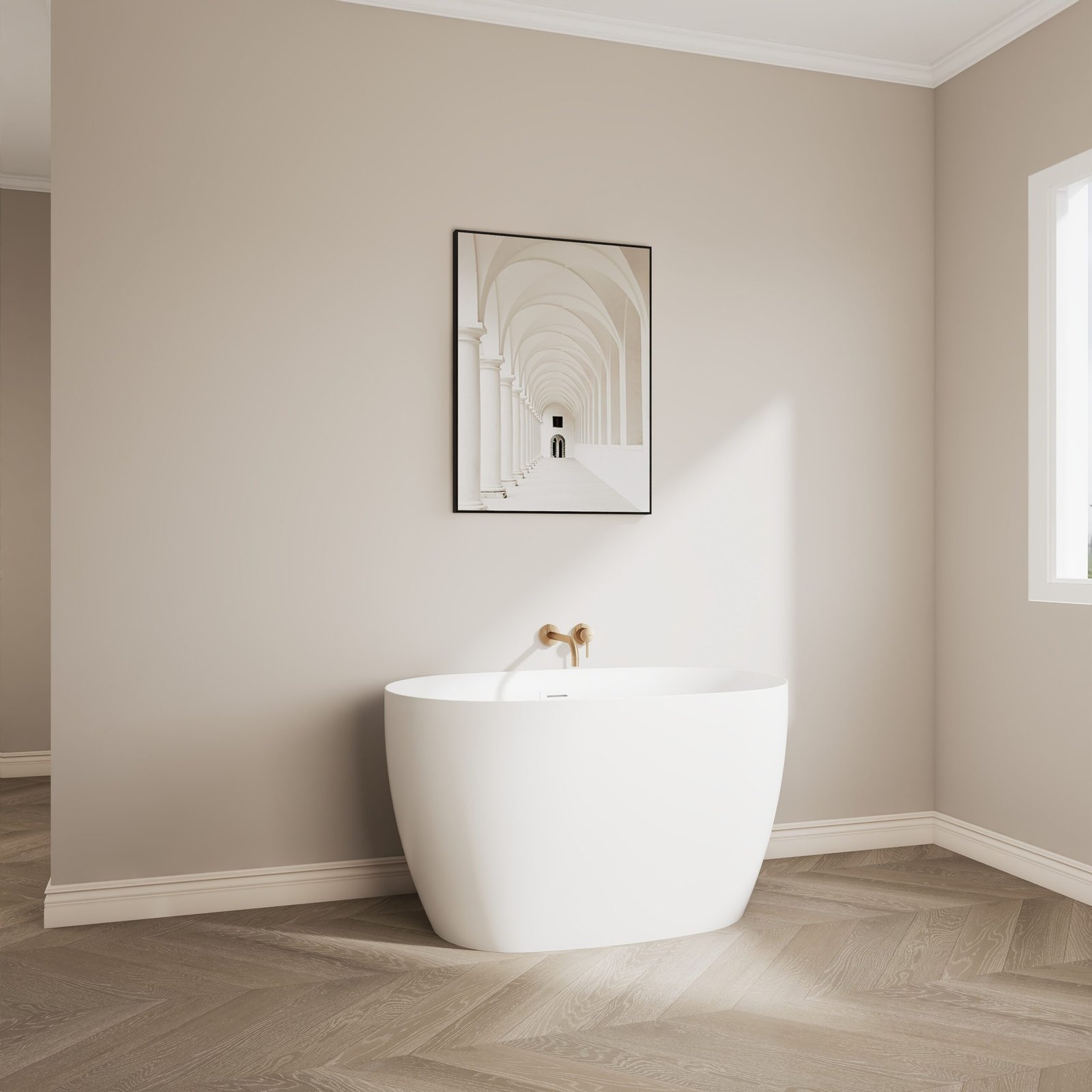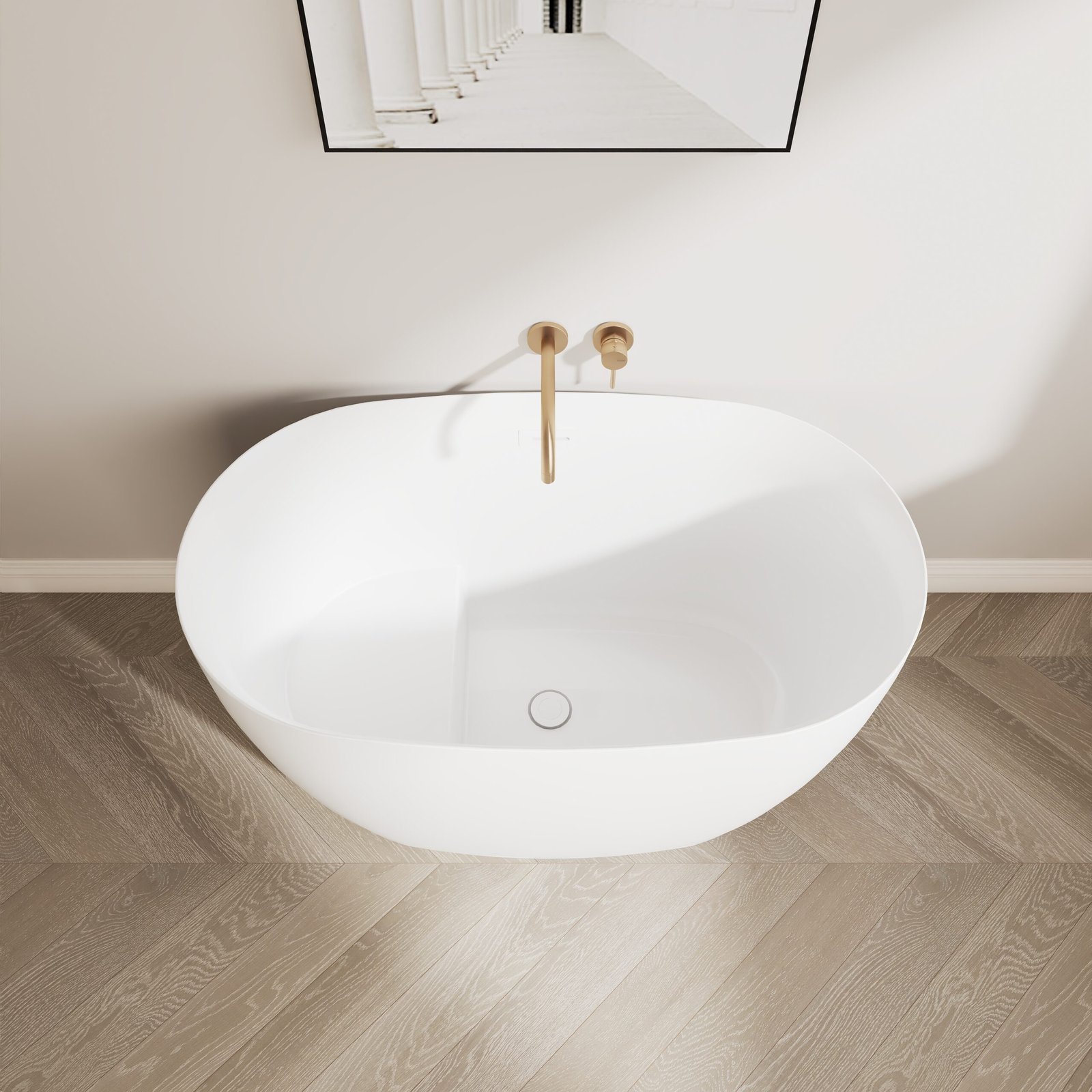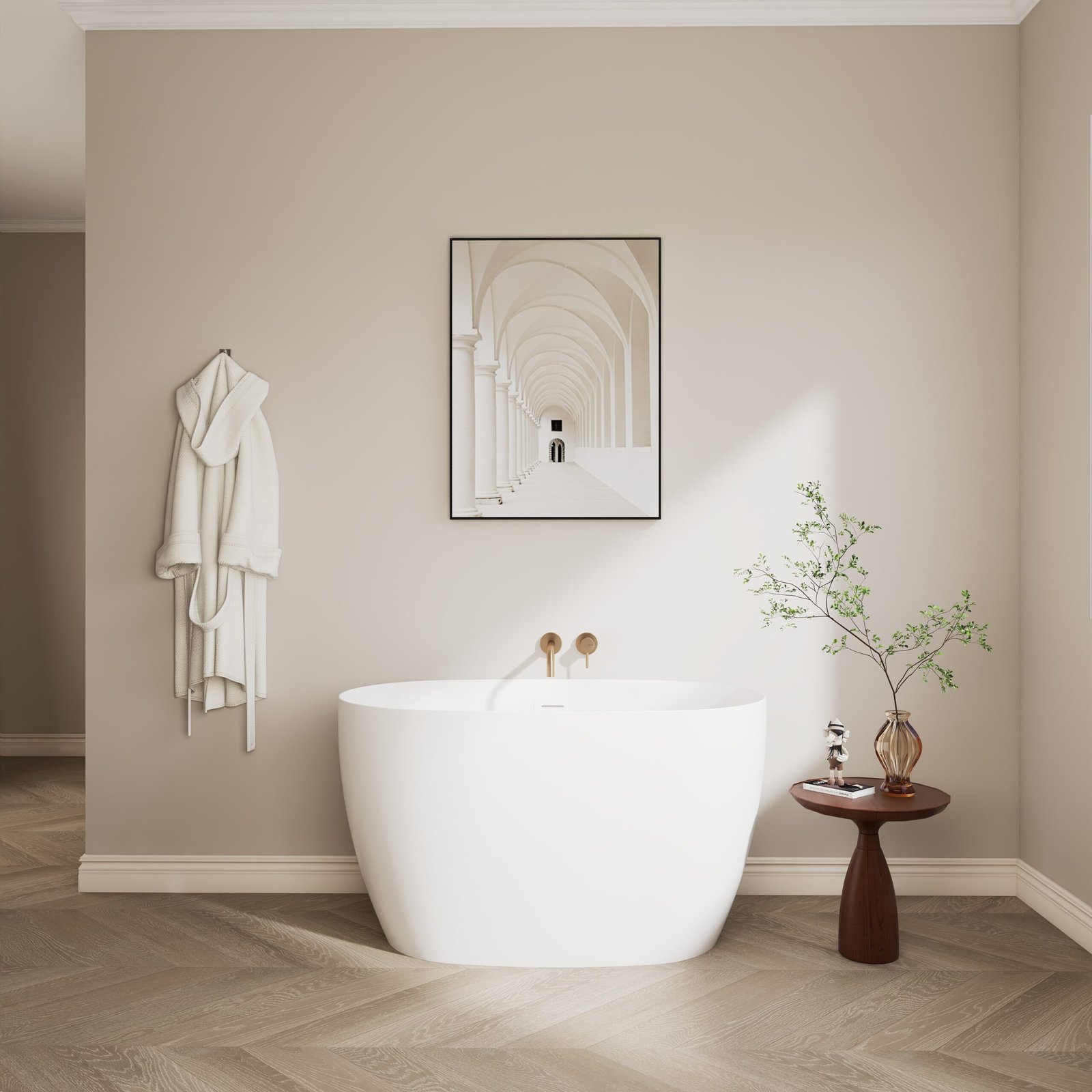 This freestanding acrylic bathtub is designed for smaller bathrooms without compromising comfort. The compact oval shape and smooth contours create a sense of harmony and warmth, offering a deep, immersive soak even in limited spaces.